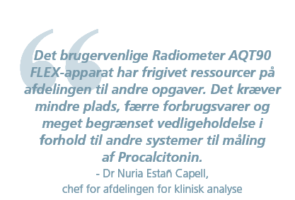 “Det brugervenlige Radiometer AQT90 FLEX-apparat har frigivet ressourcer på afdelingen til andre opgaver. Apparatet kræver mindre plads, færre forbrugsvarer og meget begrænset vedligeholdelse i forhold til andre systemer til måling af Procalcitonin.